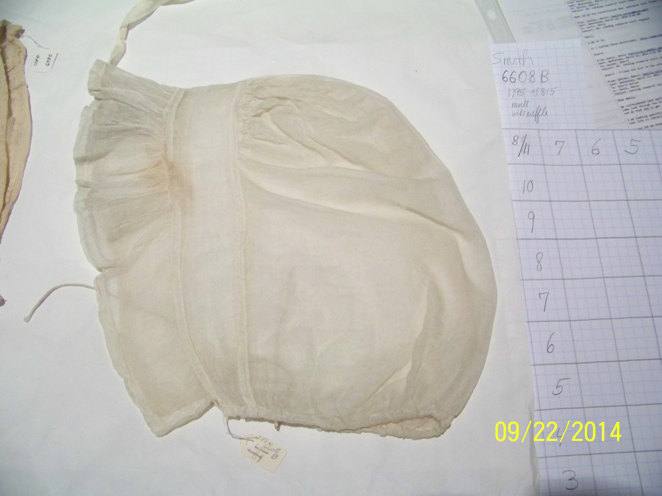 The museum dates this cap 1795-1815, so it just barely qualifies as 18th C. Since we can’t ask the curator who assigned these dates so long ago, we don’t know what that person saw to prompt her to date this one later than Smiths 6608. I think that the wider hems and cotton cloth are clues to a later date.