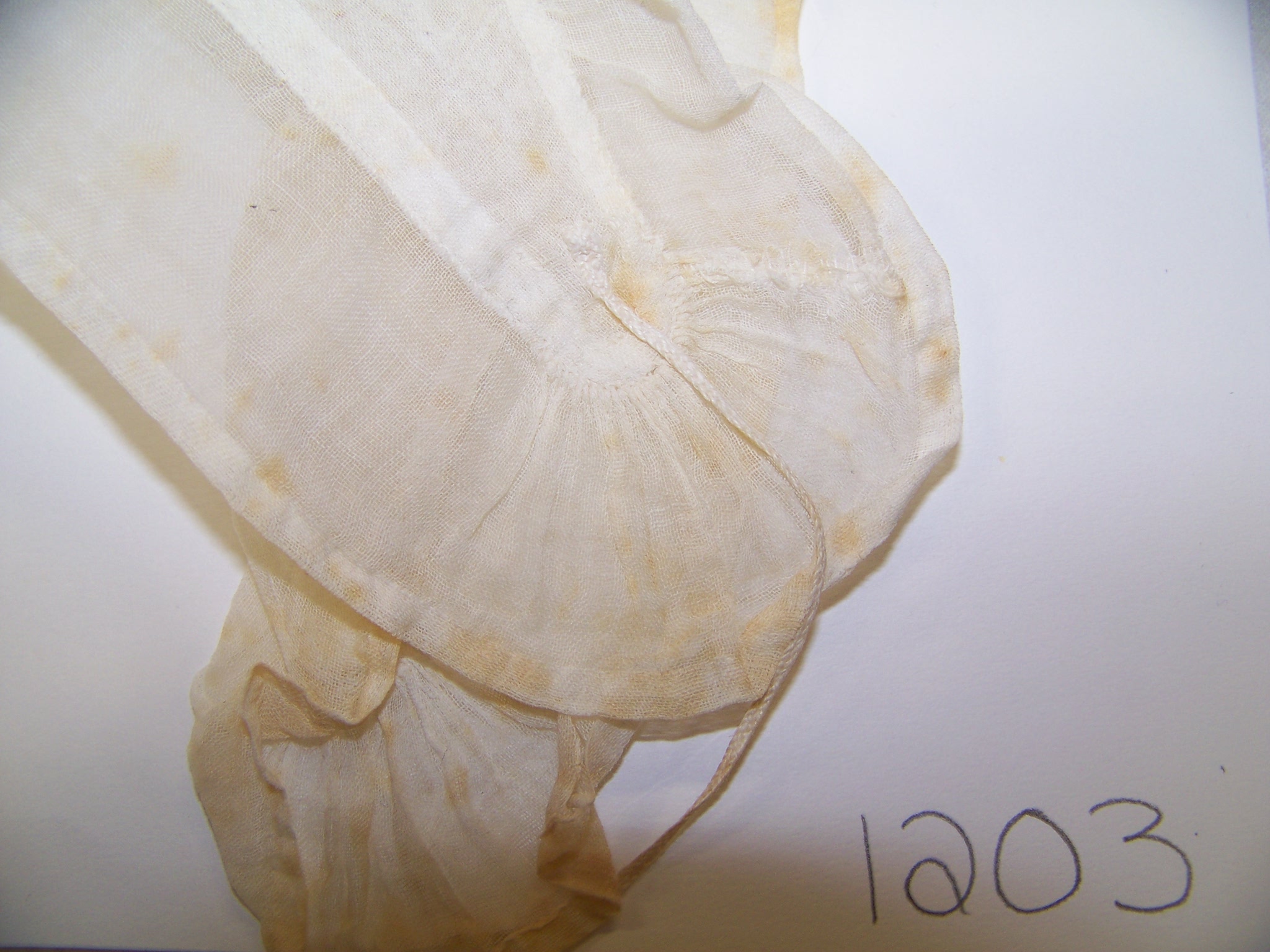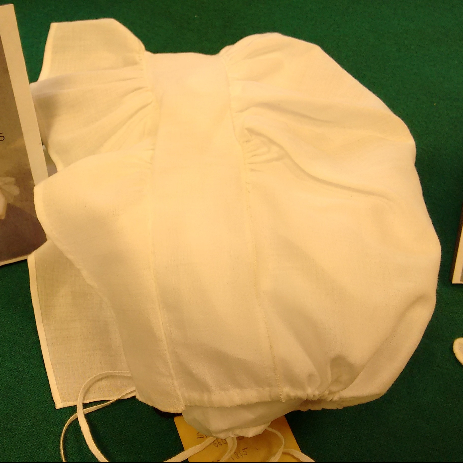 It’s made of three pieces, all on the straight grain: semicircular caul, 1 3/4″ straight headpiece, and a ruffle that’s wider at the CF than the bottoms. The headpiece is pieced at the top with a felled hem. That’s pretty common. Gathers on the caul and the ruffle are rolled, whipped, gathered all in one stitch, making a pretty popcorn effect inside that goes across the top 4″ on the headpiece, the top 8″ on the ruffle. The headpiece is hemmed 1/8″ all around, and the hem of the ruffle is 1/4″. A casing runs along the bottom of the caul and headpiece, allowing the strings to come out right under the ears.