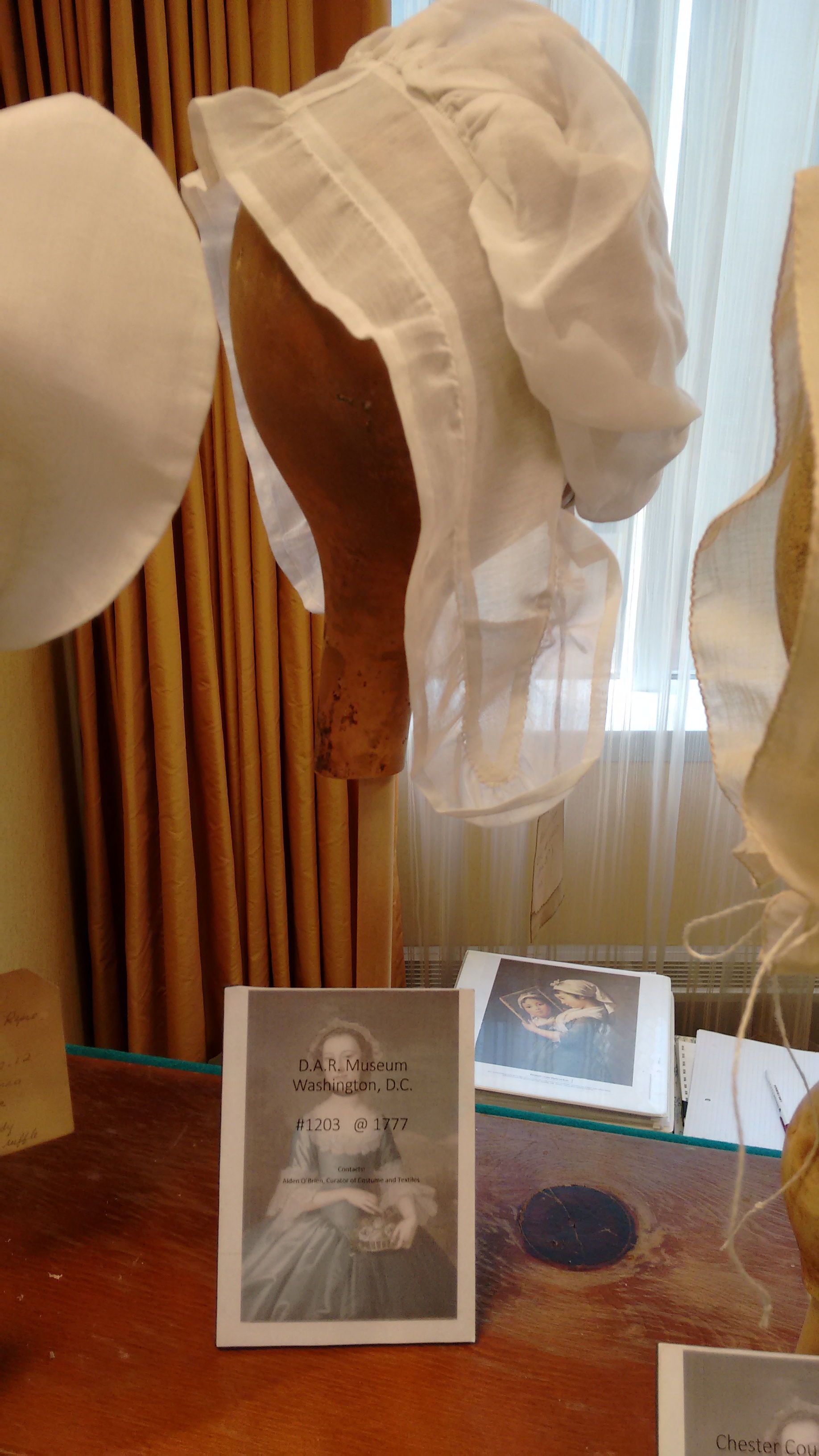 What don’t I understand? The two round-eared caps have straight headpieces. I keep recommending Kannik’s cap pattern, but really her cap isn’t like these at all. That cap I wear, that I’ve replicated a dozen times, has a moon-shaped headpiece, and a shaped ruffle that is gathered all the way down. Many French portraits have detailed renderings of caps, but for American caps, Mrs. Brewster is abut the only one I can see any detail. This portrait is 1795-1800, so it fits the time period given the cap. I think her headpiece is straight, too.