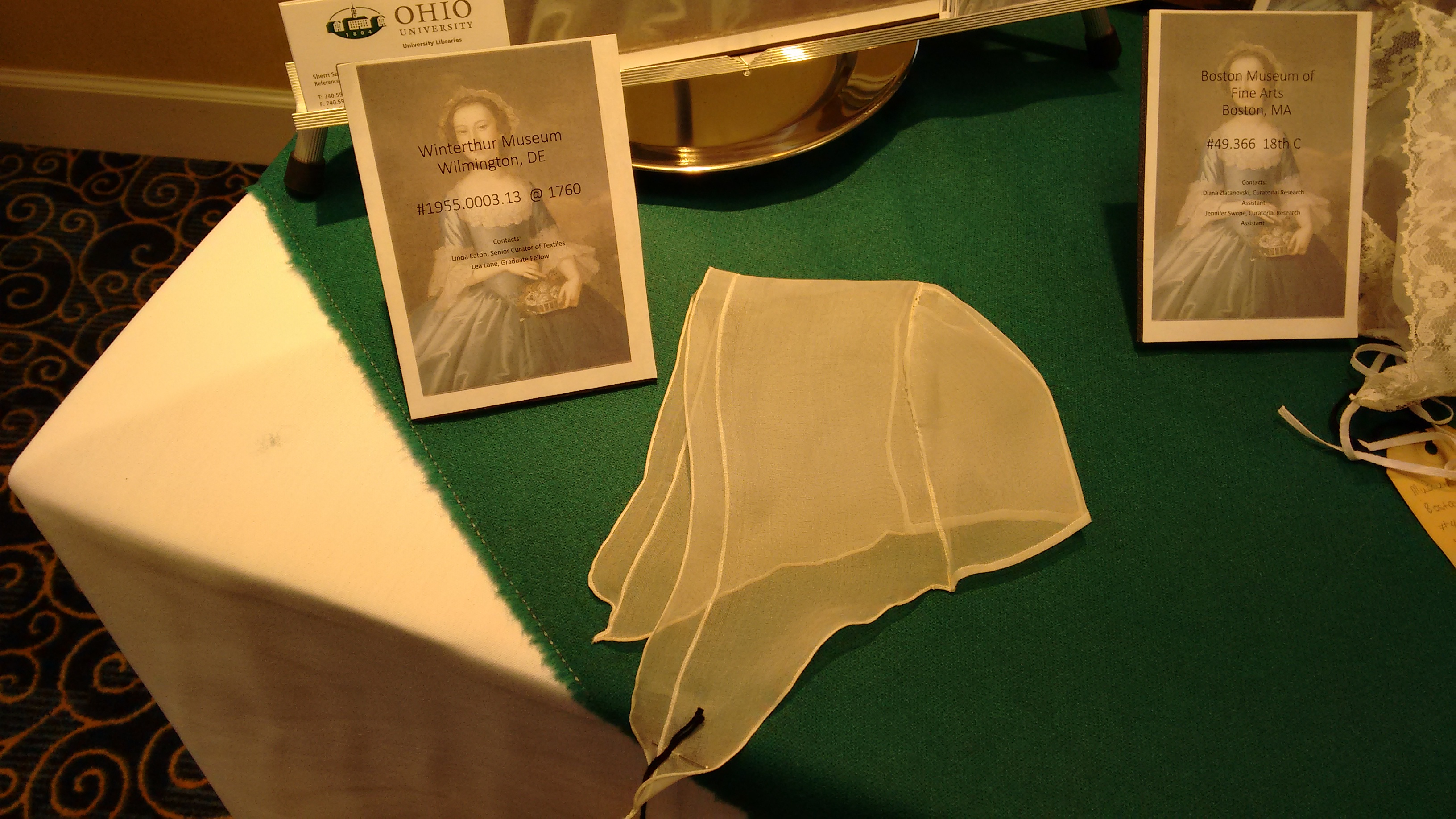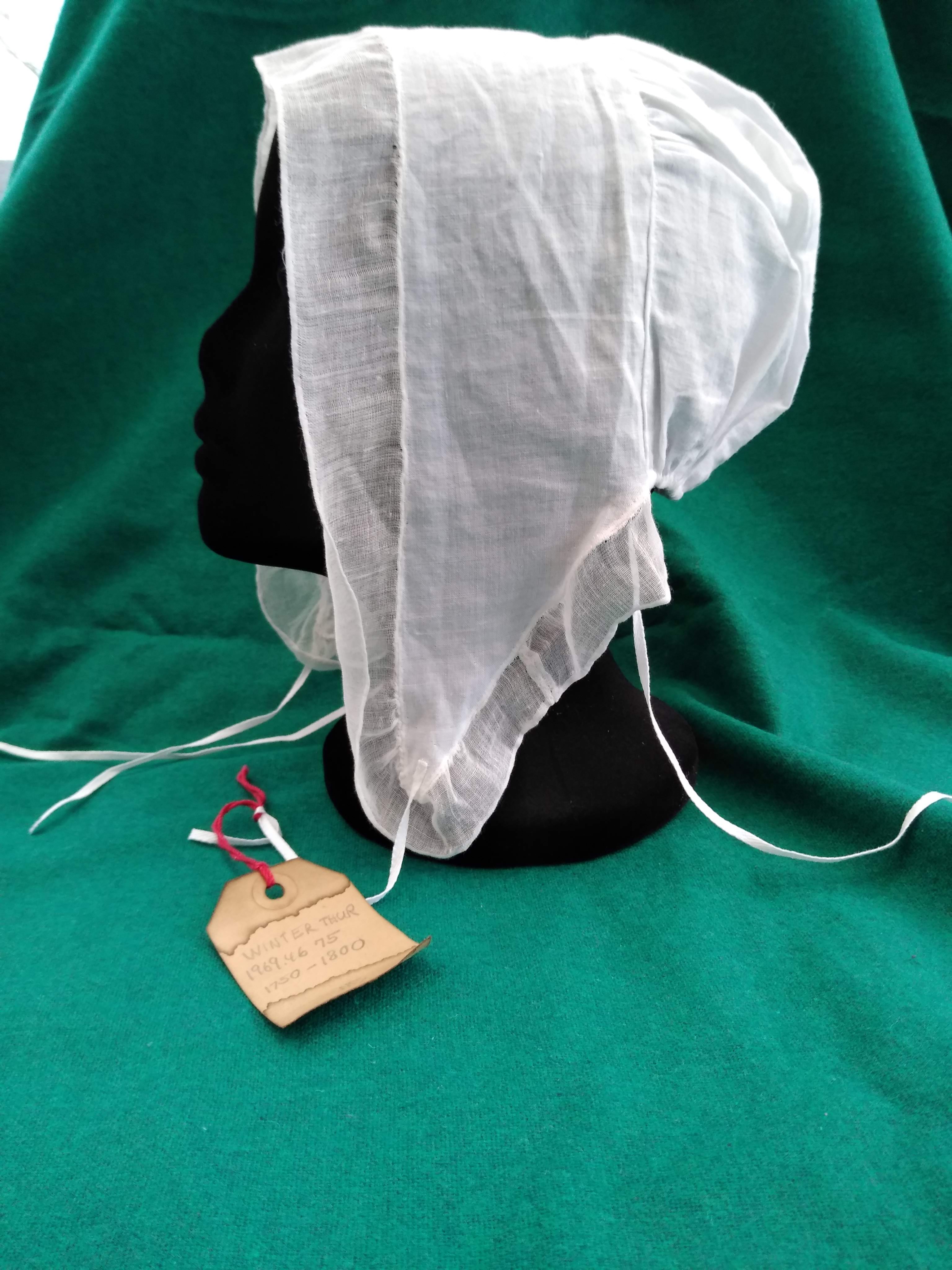 This is very similar to many other Quaker caps I saw in my travels, especially a group from Chester County Historical Society, but also individual examples in other places. It’s the only squared-lappet one museums date 1750-1800, though, and I want to talk about that while I suggest it’s more probably 19th C. This one is housed at the Phildelphia History Museum. Its item number is #87.35.826. It does not have an online catalog record.