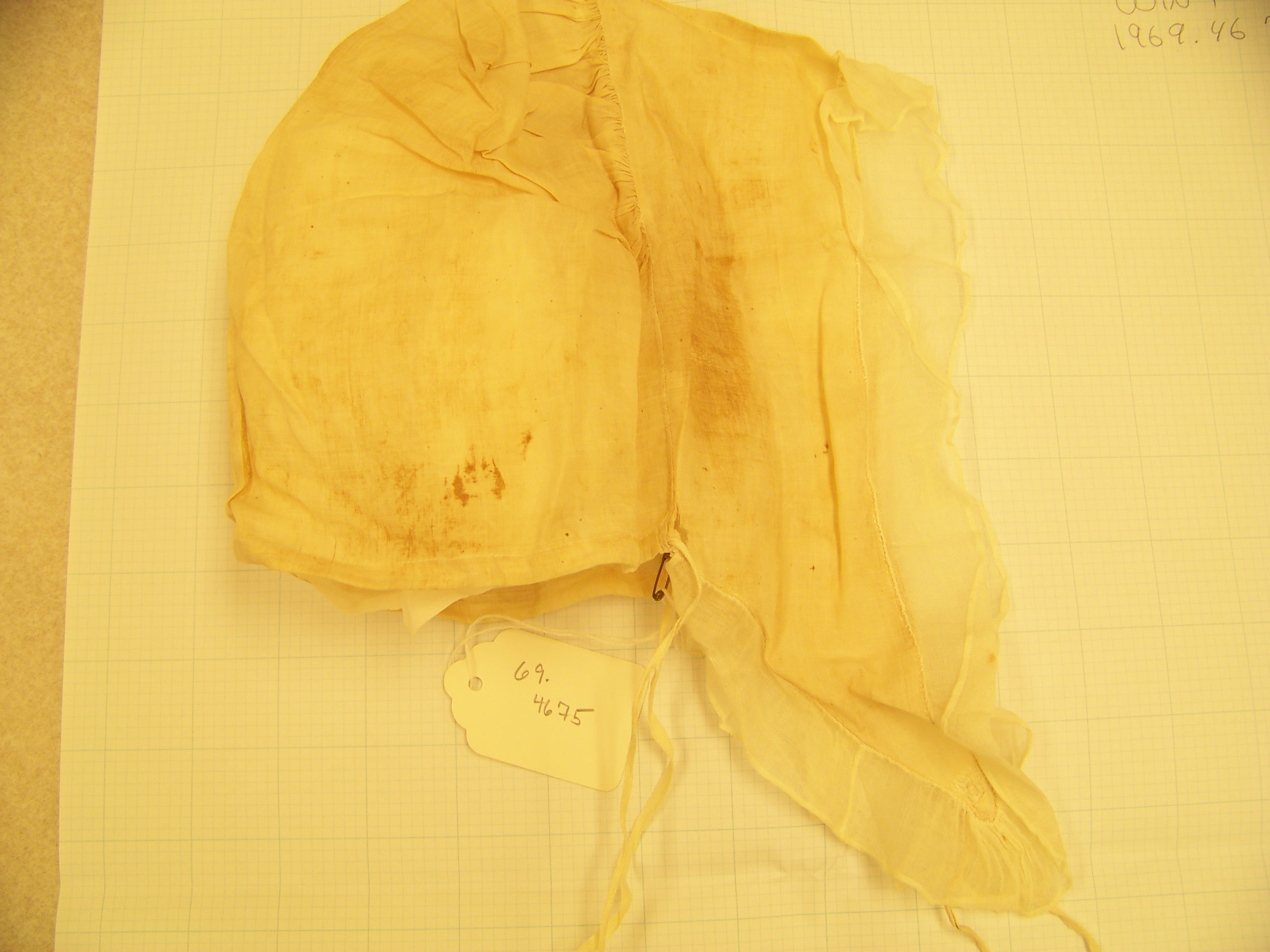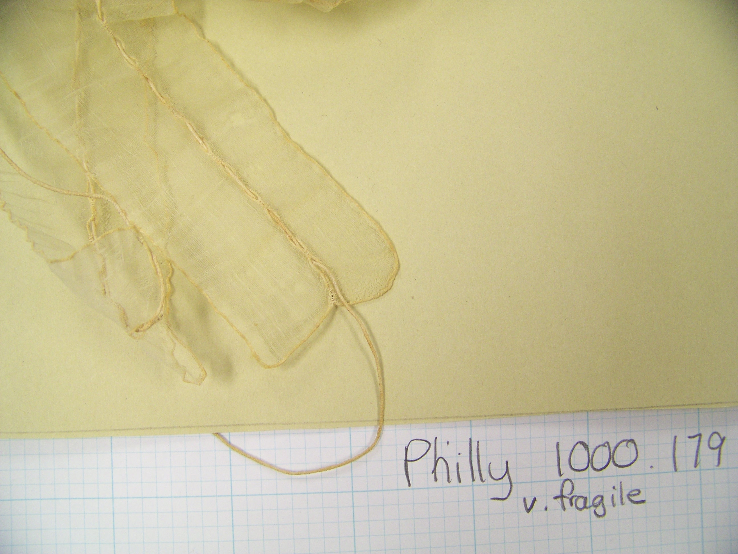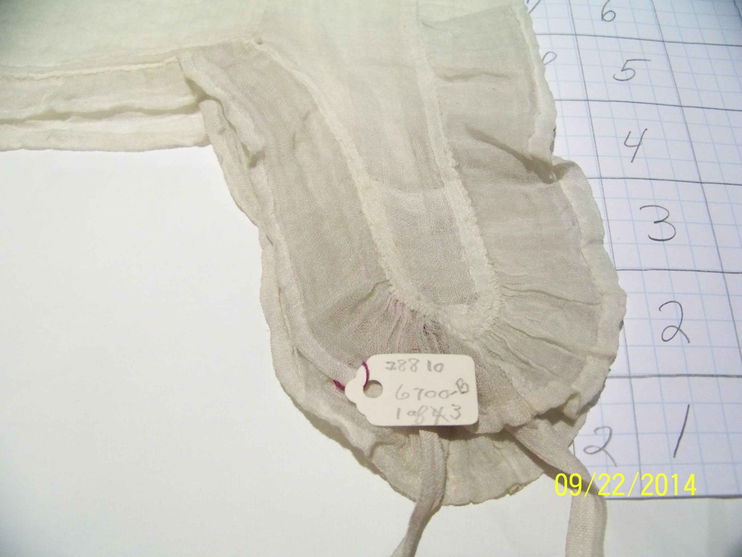 The characteristic that most gives away this cap’s 19th C date is the square end of the lappets. That seems to be one detail that curators I talked to agreed was a dividing point. In other examples, the gather up the middle of the lappet is created by finishing the edges of 2 rectangles, and leaving gaps in the join where the string is threaded. Here’s an example of that technique in another Philly cap, #1000.179.