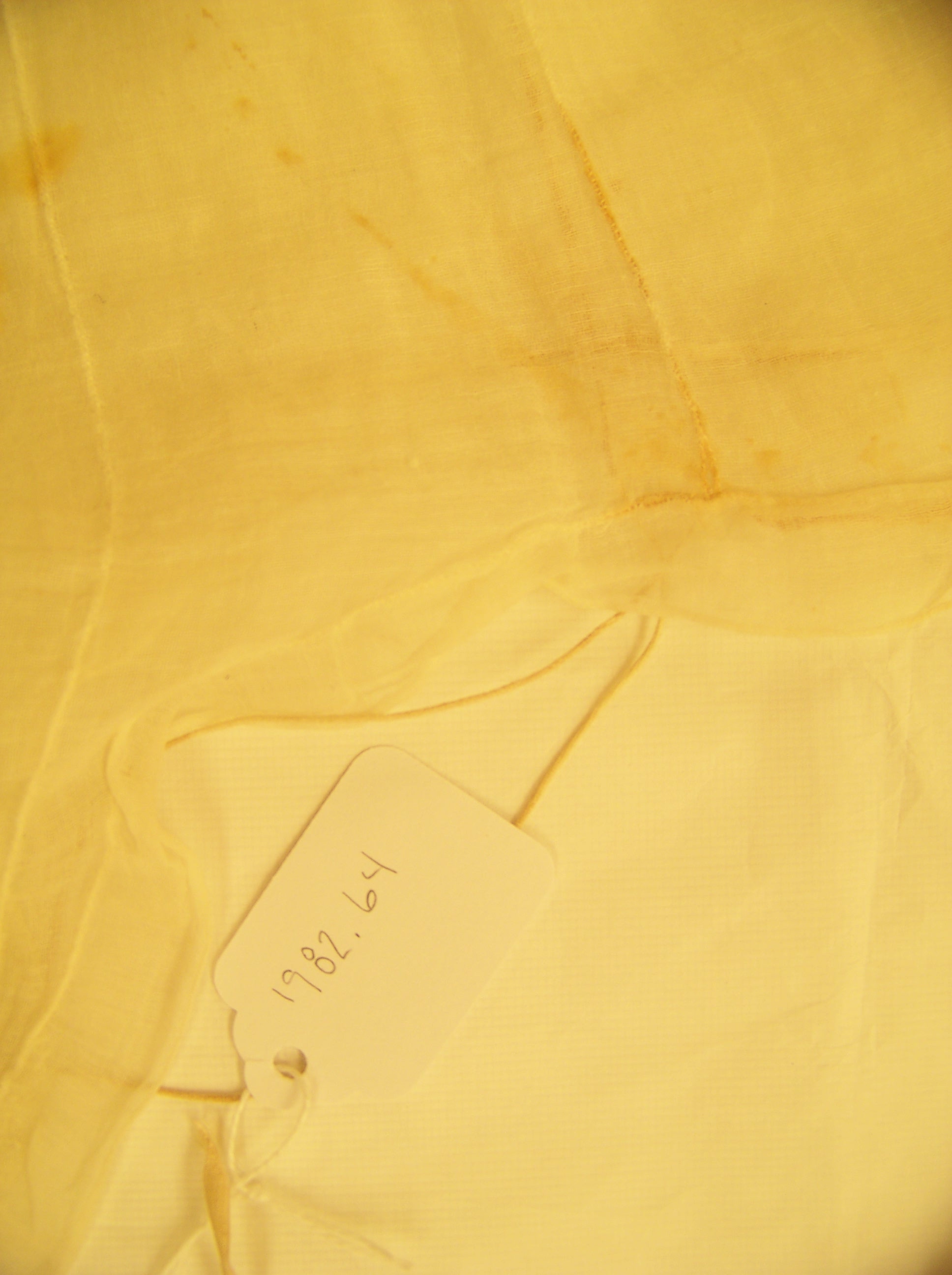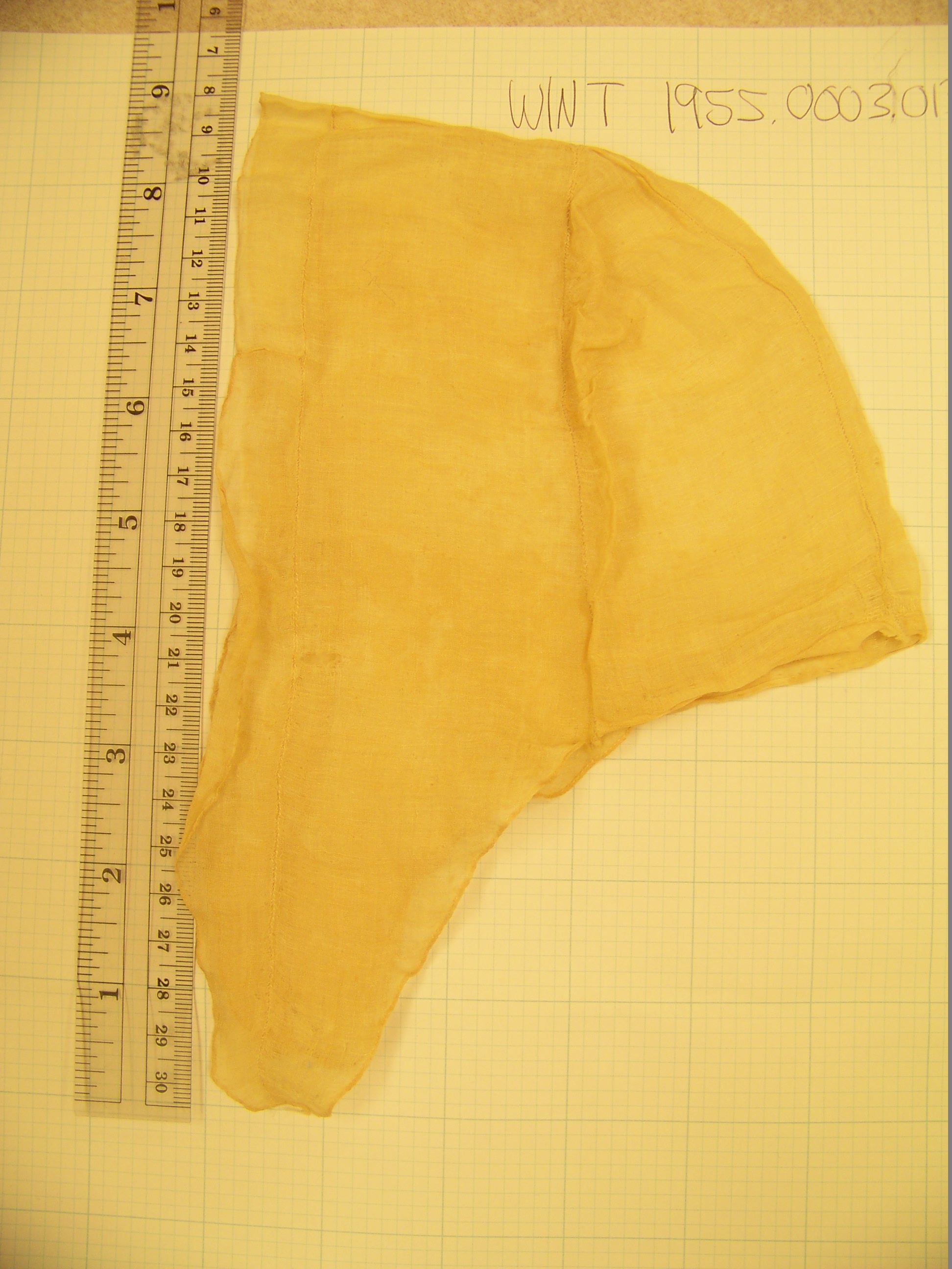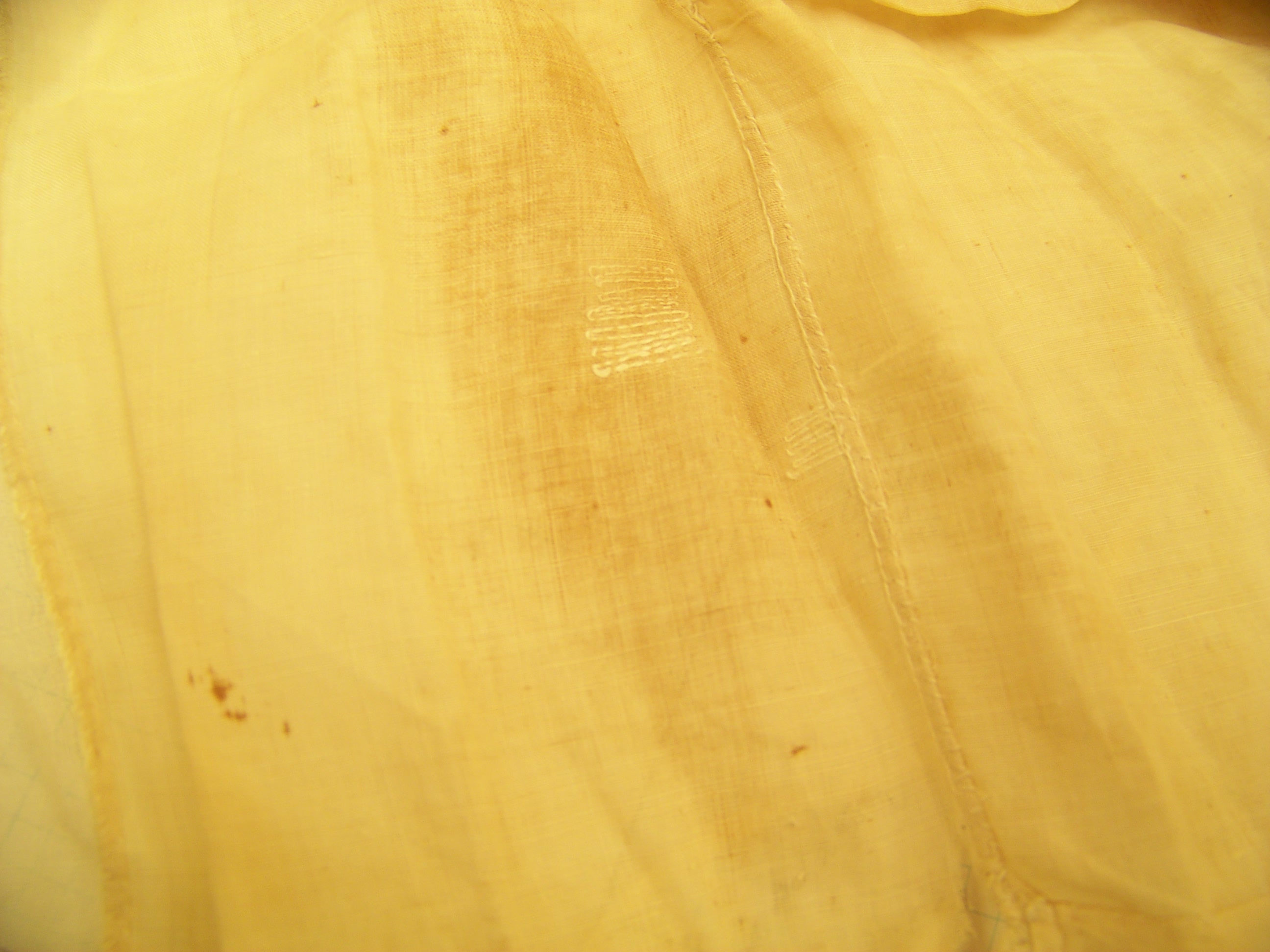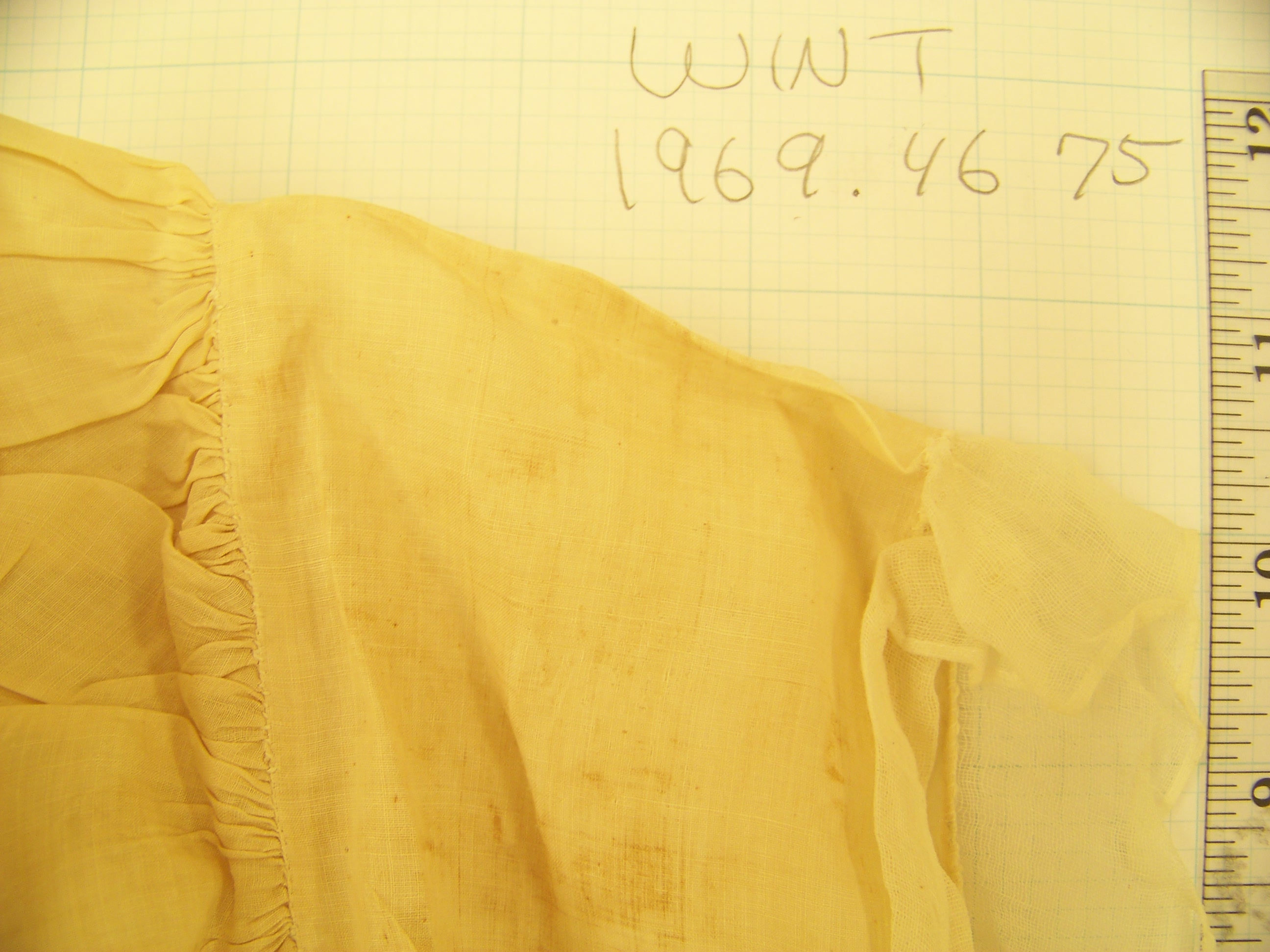 The characteristic that most gives away this cap’s 19th C date is the square end of the lappets. That seems to be one detail that curators I talked to agreed was a dividing point. In other examples, the gather up the middle of the lappet is created by finishing the edges of 2 rectangles, and leaving gaps in the join where the string is threaded. Here’s an example of that technique in another Philly cap, #1000.179.