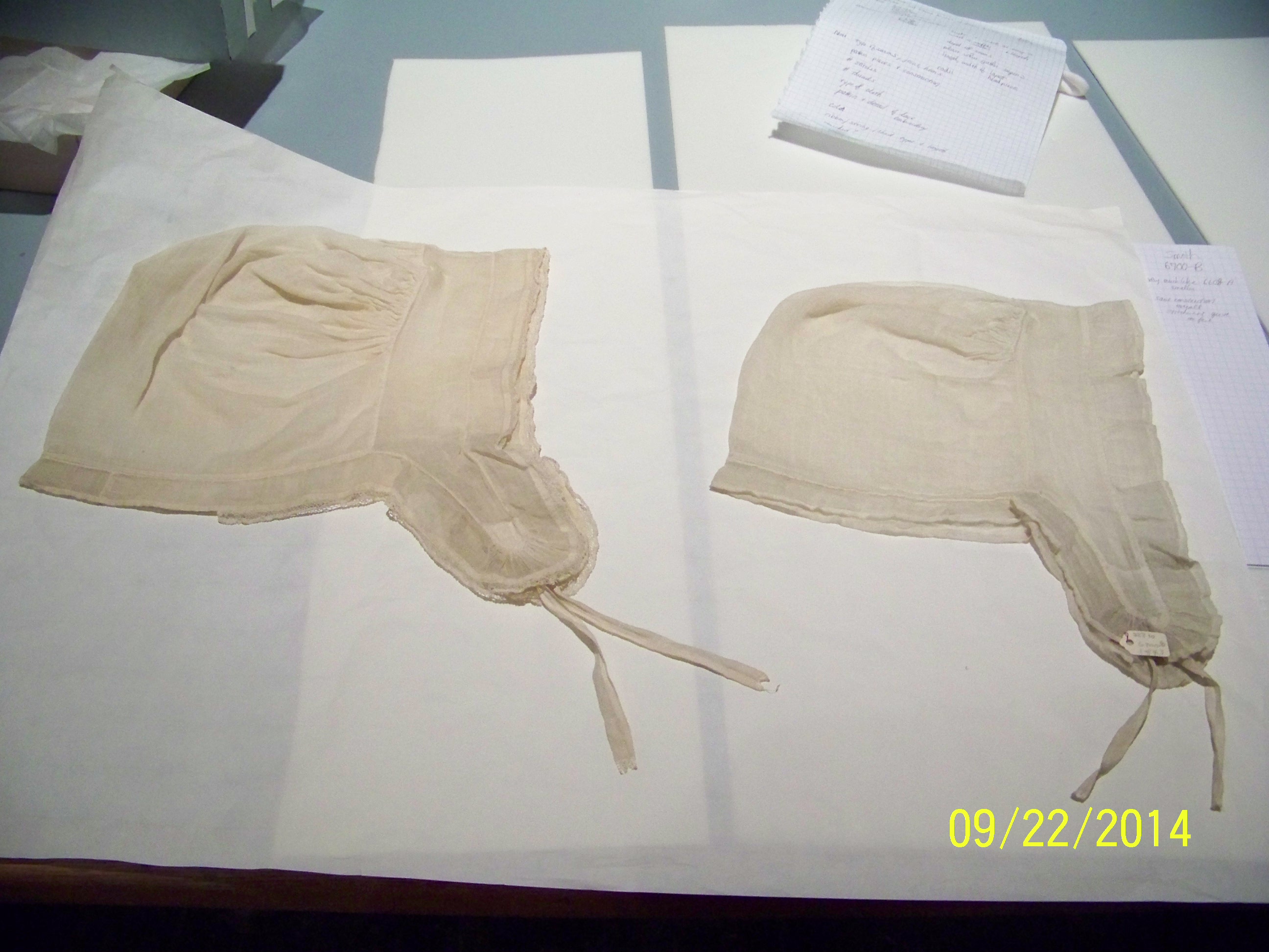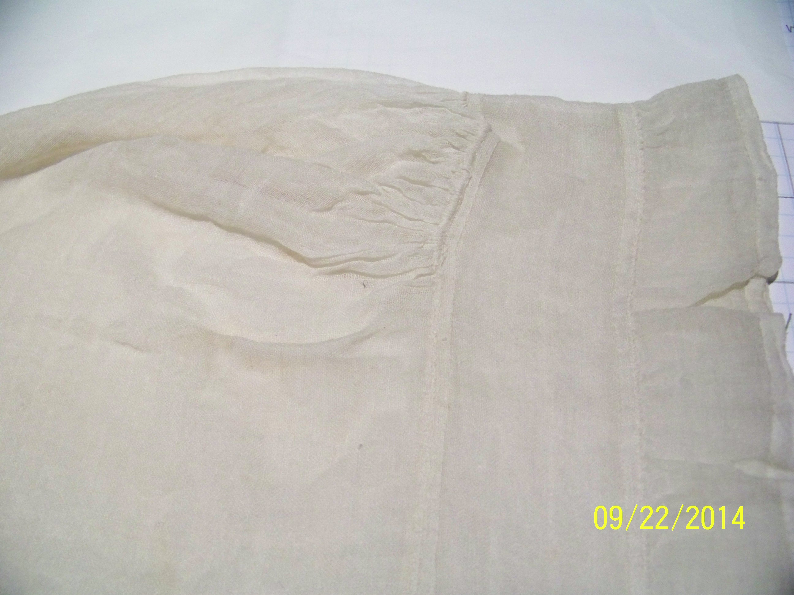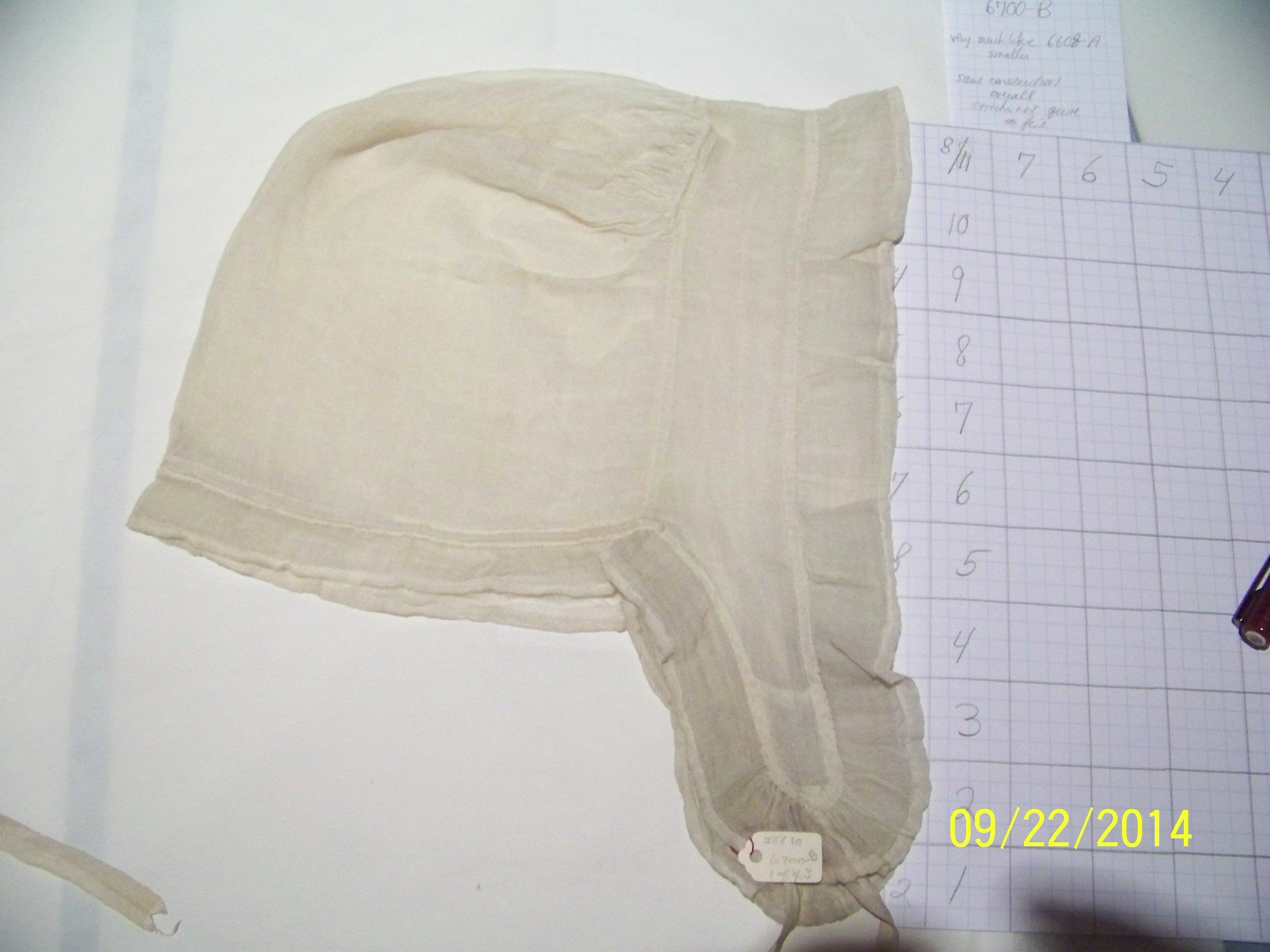 I’m making a judgement call on the idea that there are only two gather strings. The one that goes up and down the front, creating the faux ruffle, might be two different strings. This cap was too fragile to manipulate much, but as it sits there is a slight pucker in the front string. Also, other Quaker caps with similar construction have sometimes a separate string, creating this false-ruffle effect. Sometimes it is just a silky thread, without even a channel, and the bow is at the CF. Kannik’s Korner pattern #6602 (view B) reproduces a cap like that.