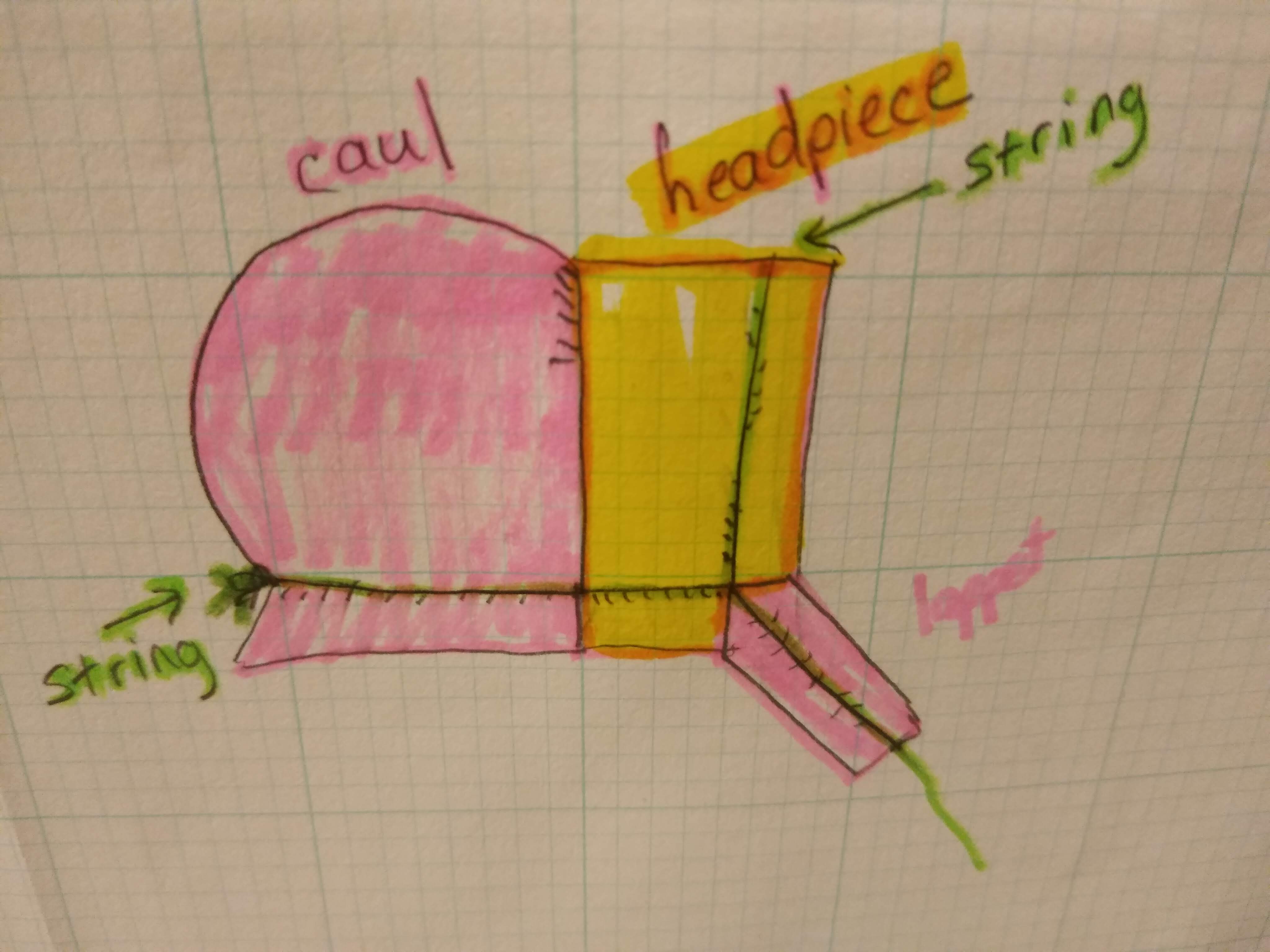 The headpiece and ruffle are all one piece. So is the caul and the bavolet, or ruffle around the nape. Then there is a third piece that’s really just the lappets pieced onto the rest of the cap. The shaping is created by strings in self-fabric channels in all three pieces. I’ve made a color-coded quick drawing to help you see what I’m talking about.